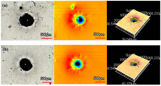 After the tests were completed, a Keyence confocal laser microscope was used to measure the wear scar width and depth. Volume loss was calculated based on the indenter radius and scar width, shown in Equation (1). ‘D’ is the diameter of the wear indenter tip, ‘t’ is the wear length, and ‘b’ is the width of the wear scar [26]. The number of passes was multiplied by the wear length to determine the sliding distance. The volume loss per sliding distance is then graphed to observe how wear progresses. The wear rate of the coating was then calculated using the slope of the curve of volume loss at a steady state divided by the wear distance.