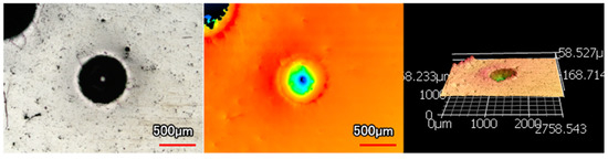 Images and 3D profiles of the Rockwell hardness tester indentations are shown below in Figure 5 and Figure 6. Figure 5 shows two examples of indents with large Hertzian indentation cracks on the monolithic Ni-P coating. Additionally, there are significant radial cracks. This cracking is a visual confirmation of its low toughness and ductility. The cracks and brittleness of Ni-P are even more jarring when compared to the indentation on Ni-P-NiTi coating shown in Figure 6. Due to the composite’s high toughness, it had minimal cracking and plastic material pile-up due to its higher ductility.