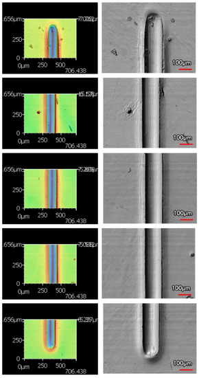 Wear tracks are categorized by coating type, indenter shape, and the number of passes. Micrographs were taken at five evenly spaced intervals along the wear track to allow the full track to be examined for its wear mechanisms. When the micrographs were taken, a laser scanned the surface to take the 3D profile for analysis. Most of the wear tracks had relatively consistent widths, apart from either end. Examples of the micrographs of wear tracks are shown in Figure 8 and Figure 9. Both wear scars are 50 pass wear tracks on 9 μm thick Ni-P, but the wear track in Figure 8 used the sharp indenter and Figure 9 used the spherical indenter.