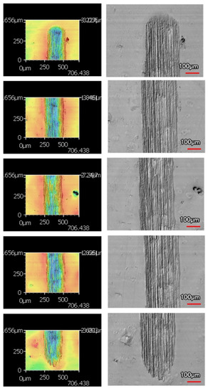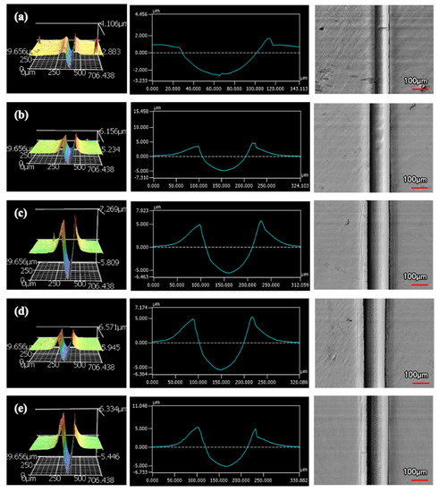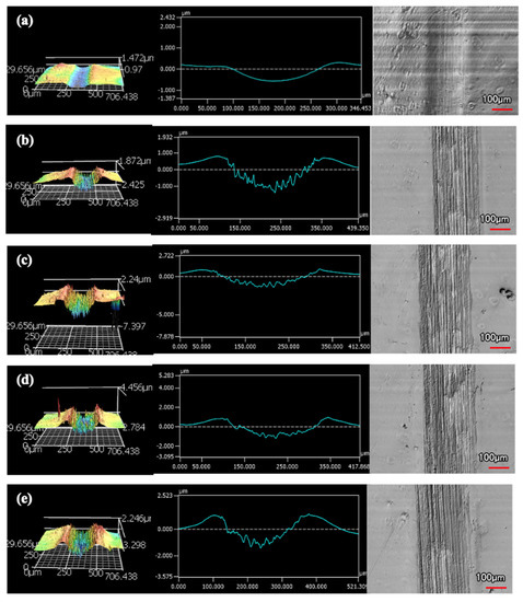 Wear Profiles from the Sharp Indenter on 9 μm Thick Ni−P Coating: (a) 1 Pass, (b) 25 Passes, (c) 50 Passes, (d) 75 Passes, (e) 100 Passes.