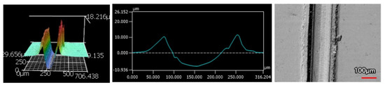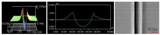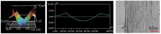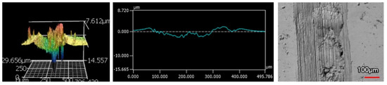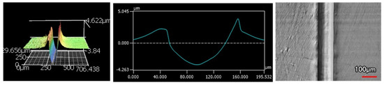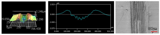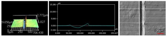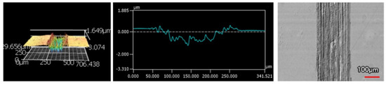 The wear tracks from the same number of passes and indenter shape are unique to the type of coating. Figure 12, Figure 13, Figure 14, Figure 15, Figure 16, Figure 17, Figure 18 and Figure 19 compare the 3D profiles of the 100-pass wear tracks for each coating. Figure 12, Figure 13, Figure 14 and Figure 15 are from the sharp indenter and Figure 16, Figure 17, Figure 18 and Figure 19 are from the spherical indenter. In the case of both indenters, the 45 μm thick monolithic coating had the shallowest wear profile. The spherical wear profiles mostly had rough wear tracks with uneven depth throughout, but the 9 μm thick Ni-P-NiTi had a rather smooth curve that was evenly deformed throughout the wear profile. These differences in profile shapes correlate with the differences in properties between monolithic Ni-P and Ni-P-NiTi nanocomposite. Namely, the higher the hardness in monolithic Ni-P, the higher the toughness in the composite. Ni-P-NiTi is more prone to localized plastic deformation due to its lower hardness, and the higher toughness would allow for the deformation to be uniform with minimal cracking. By the same reasoning, monolithic Ni-P is susceptible to concentrated failures such as large cracks as opposed to plastic deformation due to its brittleness.