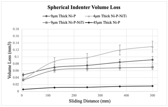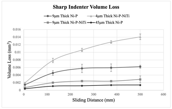 Figure 20 and Figure 21 show how volume loss changes with the wear sliding distance for each coating, where Figure 20 compares the sharp indenter scars and Figure 21 compares the spherical indenter scars. The pileup at the scar edges was excluded in the calculations of volume loss, and further confirms the wear depth profile observations. The standard deviations were found using the five intervals of wear depth measurements taken on the wear scar. In both indenters, the 4 μm thick Ni-P-NiTi coating experienced the greatest degree of volume loss while the 45 μm thick Ni-P coating experienced the least.