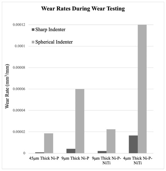 The wear rate was calculated from the slope of the volume loss curve at a steady state. Figure 22 compares the wear rates of each coating and indenter. The wear rates reflect what was shown on the volume loss graphs, where the highest wear rate was 4 μm thick Ni-P-NiTi coating and the lowest wear rate was 45 μm thick Ni-P coating. Consistently, the spherical indenter produced a higher wear rate than the sharp indenter. This was due to both the difference in geometries between the indenter styles and the higher load on the spherical indenter. Thinner coatings have higher amounts of volume loss and a lower wear rate than their thicker counterpart. Comparing the 9 μm thick Ni-P-NiTi to the 9 μm thick Ni-P, the composite had lower wear rates. This was particularly drastic in the spherical indenter scars.