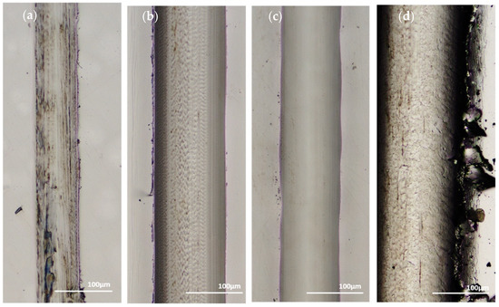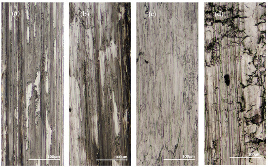 One hundred Passes of the Sharp Indenter on the Surface of: (a) 45 μm Thick Ni-P, (b) 9 μm Thick Ni-P, (c) 9 μm Thick Ni-P-NiTi, (d) 4 μm Thick Ni-P-NiTi.