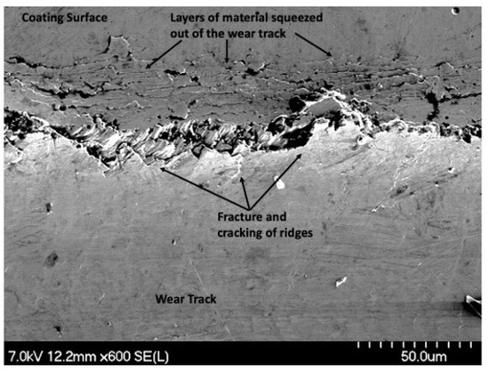 SEM Image of Delamination, Particle Removal and Particle-Crack Interaction on the 100 Pass Wear Track on the 4 μm Thick Ni-P-NiTi Coating.