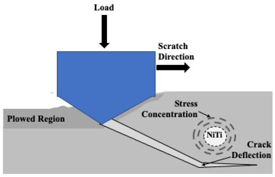 Further delamination and particle removal are visible in Figure 28. Additionally, both Figure 28 and Figure 29 show indications of toughening mechanisms from particle-crack interaction. The images have both forms of crack deflection, one with particle-crack interaction and one without. The spots labeled as crack deflection are where the crack contacted the particle which caused it to change paths and lose its fracture energy in the process. This is depicted in a schematic drawing in Figure 30. The areas in Figure 28 and Figure 29 that are labeled as a crack around a particle are crack deflection with indirect particle contact. The stress field around the particle is what changed the propagation’s path instead of a crack contacting the particle directly, and is shown as a representative illustration in Figure 31. The deflection of cracks when they come close to a NiTi particle is due to transformation toughening. The transformation occurs because as the crack approaches a NiTi particle, it produces a high-stress field. The stress induces the super-elastic NiTi to transform into martensite and expands which surrounds the particle with compression. This leads to crack deflection and loss of crack energy. Furthermore, the transformation also absorbs the crack energy leading to crack arrest. This mechanism is what causes toughening of the coating.