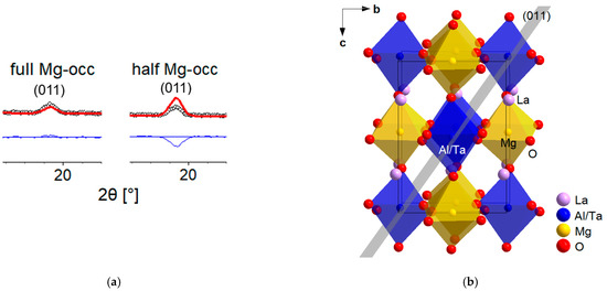 The data sets from X-ray and neutron experiments were obtained on the same LAMT powder at room temperature and were used simultaneously in a combined Rietveld analysis. The background parameters, the lattice parameters, the sample displacement parameters and the peak profile parameters were refined separately for each data set. For the PXRD data, a fundamental parameters approach [15] implemented in the software TOPAS was utilized to describe the peak profiles, which takes the instrumental settings into account. The broadening of the peak profiles, in this case, can then be ascribed to the microstructural effects of the sample, i.e., domain size and microstrain. Now, a more accurate crystal structure model refinement can be carried out involving the two data sets simultaneously, but refining the atomic parameters jointly. Returning to our crystal structure models described in Section 3.2., the NPD data responded sensitively to the B-site cation ordering due to the significantly different scattering lengths of Mg and Al. A notable discrepancy between the observed and the calculated Bragg peak intensities was now detectable for each structure model, as shown in Figure 1a. The (011)-Bragg peak chosen here as an example represents a lattice plane in the monoclinic P21/n unit cell where the B-site cations are aligned (Figure 1b). The Rwp of the two structure models are Rwp = 4.33% for the full Mg occupancy and Rwp = 4.43% for the half Mg occupancy, respectively.