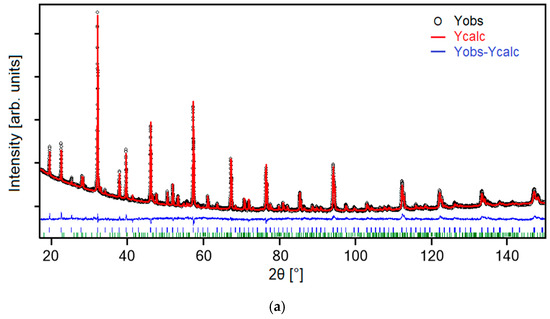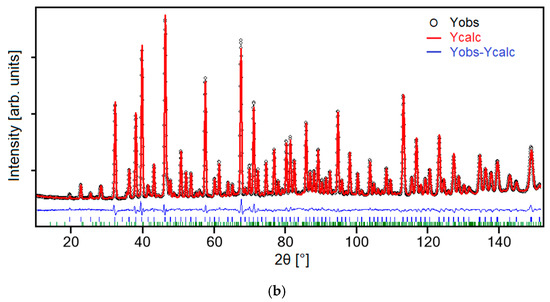 PXRD was carried out using Empyrean (Malvern Panalytical, Almelo, The Netherlands with CuKα1,2 radiation at 45 kV and 40 mA. The PXRD data were collected in the 2θ range of 10° to 150° with Δ2θ of 0.013° and a counting time of 500 s/step using a 255-channel PIXcel linear detector.