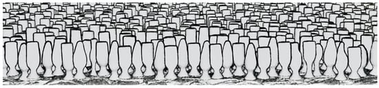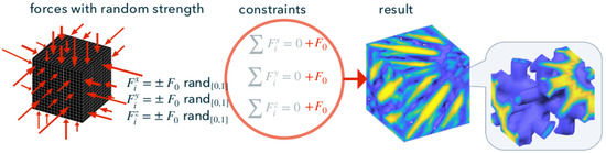 However, while it is similar, it is also different from the silicon (Si) electrode particles in batteries, which are exposed to large deformations. According to [17], up to now, only a few structural designs, such as porous, core-shell, yolk-shell, and solid nanostructures, have been proposed for silicon anodes, some of them inspired by nature. However, recently, the topology optimization of electrodes has gained more and more attention [18,19]. For the anode design and the improvement of its electrochemical performance, it is crucial to identify the repeated volume expansions (up to about 300% [20]) and contractions during lithiation and de-lithiation, as the key failure mechanism of Si. Particle swelling leads to structural pulverization, electrical disconnection between the active materials and the current collector, continuous exfoliation, and consumption of the active Si and electrolyte of active Si particles [17,21,22]. All these failures can be assigned to the topology of the anode: (i) the increased consumption of the electrolyte (side reactions) could be related to a high surface area, (ii) a materials-dependent fracture occurrence above a specific particle size, and (iii) electrical conductivity issues due to point-to-point contact. As a result of the swelling, interactions with adjacent particles occur randomly, as shown in Figure 2. Most recently, contact has been added to the optimization, e.g., by [23,24,25,26]. Moreover, it was found that the contact stress is in the range of diffusion-induced stress under the free-expansion state [27].