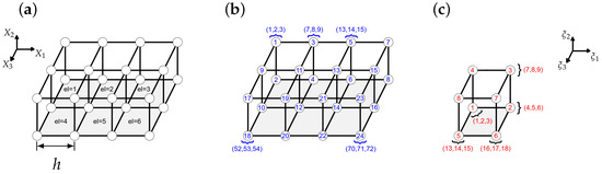 As in the simplest case, the reference geometry is assumed to be a cuboid to solve Equation (21). This reference cuboid is subdivided into (,,) equidistant elements, such that the total number of elements is . The elements are numbered successively along the , then the , and lastly the direction, see Figure 3a.