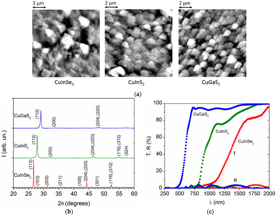 The structural, morphological and optical properties of these films were analyzed in a previous work [23], where the surface morphology was examined via atomic force microscopy (AFM) with a Park XE-100, and the tetragonal chalcopyrite structure was identified by means of X-ray diffraction (XRD) performed in a Philips X’pert instrument with radiation CuKα (λ = 1.54056 Å) and a Bragg–Brentano θ–2θ configuration. Figure 1a shows representative AFM images and Figure 1b displays the diffraction patterns corresponding to 600 nm thick films, where all the peaks are indexed according to the standard powder diffraction files for chalcopyrite CuInSe2 (card file no. 40-1487), CuInS2 (no. 27-0159), or CuGaS2 (no. 25-0279), without secondary phases.