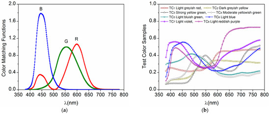(a) Color matching functions and (b) test color samples defined by the International Commission on Illumination (CIE) [15], which were used for the various XYZ calculations.