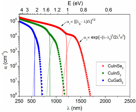 giving the gap wavelength λg = 560 nm for CuGaS2, λg = 870 nm for CuInS2 and λg = 1220 nm for CuInSe2, in good agreement with the literature, which establishes direct transitions for chalcopyrite compounds [25,27,28]. The presence of some absorption at λ > λg (or E < Eg) is due to tail states that are also typical of chalcopyrite materials [29]. In this other region, the absorption coefficient can be fitted to the form