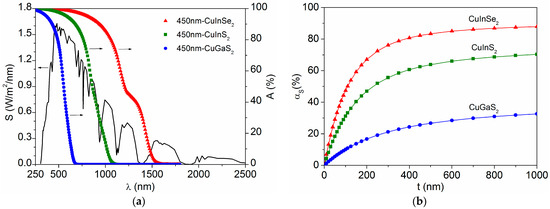 The incident solar irradiance is illustrated in Figure 4a for the standard AM1.5, which has an integrated value 993 W/m2, being 4% in the ultraviolet region (λ = 250–380 nm), 53% in the visible region (λ = 380–780 nm), and 43% in the near infrared region (λ = 780–2500 nm) [33]. Figure 4a also includes the absorptance spectra corresponding to 450 nm thick chalcopyrite films in order to compare the optical characteristics of the different compounds with the solar irradiance. Moving on to a quantitative evaluation, Figure 4b represents the percentage of total solar irradiance that is absorbed by each chalcopyrite compound, calculated from Equation (4) depending on the film thickness. The solar absorptance increases quickly with the thickness up to t~450 nm, at which point a value of αS = 26% is obtained for CuGaS2, αS = 62% for CuInS2 and αS = 82% for CuInSe2. However, the increment for each compound is only about 6% from t = 450 nm to t = 900 nm. On the other hand, a value of αS = 26% is obtained for 80 nm thick CuInS2 and 45 nm thick CuInSe2. The comparative analysis indicates that 70 nm thick CuInSe2 absorbs as much solar irradiance (αS = 37%) as 130 nm thick CuInS2 and 900 nm thick CuGaSe2.