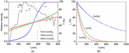 (a) Comparison of standard illuminant D65 and standard photopic vision V with the spectral transmittance of various chalcopyrite films with τL = 50%, and (b) luminous transmittance for each chalcopyrite compound as a function of its thickness.