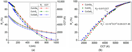 Figure 6a depicts the evolution of the average color rendering index, Ra, calculated using Equation (19), and the correlated color temperature, CCT, calculated using Equation (9), depending on the chalcopyrite film thickness. An analogous behavior is observed for these parameters, both decreasing as the film thickness increases, and similar values are observed for the three chalcopyrite compounds, despite their different luminous transmittances. In fact, for a given thickness, Ra and CCT are found to be slightly higher for CuInSe2 and CuInS2 than for CuGaS2, contrary to their respective τL values shown in Figure 5b. This is because not only a higher transmittance but also smoother variations in the visible range provide better color rendering [35]. According to the criteria for semitransparent glazing [19], a good index Ra ≥ 60% is obtained for the various chalcopyrite compounds with thickness t ≤ 250 nm, and an excellent Ra ≥ 80% is obtained for t ≤ 130 nm. Regarding the color temperature of the transmitted light, the values CCT > 3000 K for t ≤ 400 nm are considered suitable for visual comfort [36]. The correlation of CCT and Ra is illustrated in Figure 6b, where the data obtained for the different chalcopyrite films follow a parabolic relationship: . Some authors report a linear fit for dye sensitized solar cells, although only in the range of 3500 K < CCT < 5500 K. Figure 6b shows that the linear relationship also applies to the chalcopyrite data in a short CCT region, but Ra decreases quickly for CCT < 3500 K, as observed for other semitransparent devices [37].