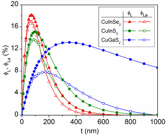 For each compound and thickness value, the solar radiation that can be collected is given by the product of the standard AM1.5 irradiance (S) and the chalcopyrite absorptance (A) at each wavelength [18]. The photovoltaic performance is thus related to the solar absorptance (αS), defined as the percentage of the total solar irradiance that is absorbed in the film: