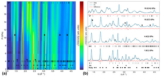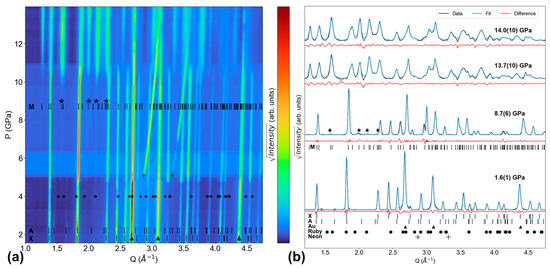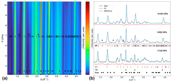 Dy-none XRD experiment. (a) Contour plot of all XRD patterns. (b) Select XRD patterns (initial, onset of monazite, final) and their LeBail fits. Monazite peaks emerge at 6.9(5) GPa. ‘X’ and ‘M’ ticks show DyPO4 peak positions for the xenotime and monazite phases, respectively [25,26]. Triangles, circles, and stars denote the peak positions of gold [28], ruby [29], and emerging monazite, respectively.