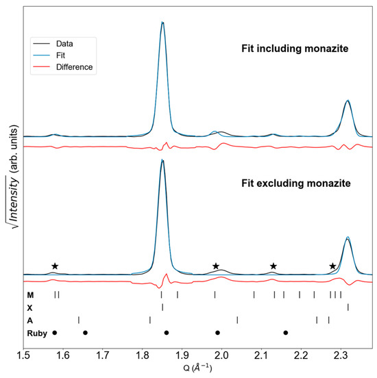 LeBail fits with and without monazite for the Ponset scan from the Tb-neon experiment. ‘X’, ‘M’, and ‘A’ ticks show TbPO4 peak positions for the xenotime [25], monazite [26], and anhydrite [27] phases, respectively. Circles show reference ruby peak positions [29], and stars indicate regions of intensity consistent with monazite peaks.
