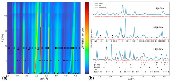 For the Tb-KCl experiment, Figure 4a shows XRD pattern evolution throughout the entire experiment, while Figure 4b shows LeBail fit quality at Pinitial (2.2(2) GPa), Ponset (5.6(4) GPa), and Pmax (11.9(8) GPa). The first scan in this experiment contains peaks belonging to xenotime, gold (upward triangle symbol), and B1-KCl (left-pointing triangle symbol). B1-KCl is the ambient pressure phase of KCl with a NaCl-type structure, and it begins transforming into the CsCl-type B2-KCl structure (right-pointing triangle symbol) at 2.3(1) GPa. Similar to neon in the Tb-neon experiment, KCl in this experiment is the most compressible material in the DAC, causing its peaks to shift in Q more than the sample’s peaks [37]. KCl peaks do not shift as dramatically as neon’s peaks in the Tb-neon experiment because KCl has a higher bulk modulus than neon.