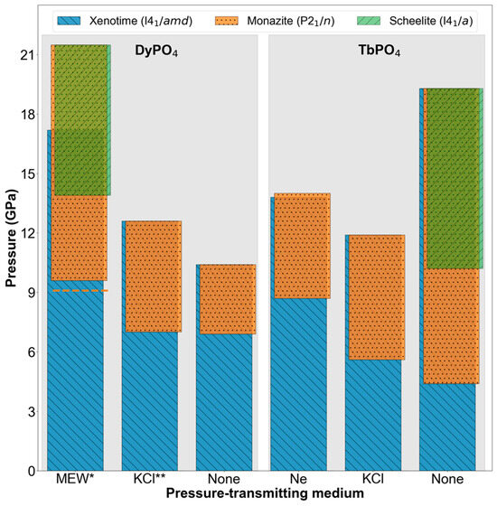 Figure 7 summarizes the DyPO4 and TbPO4 phase behavior transformation data reported in this study as well as in two prior DyPO4 studies [7,9]. In the DyPO4 section, phase data from an experiment using the MEW PTM (Dy-MEW [7]) are shown, since a prior experiment using neon (Dy-neon [9]) did not reach pressures high enough to gauge the xenotime–monazite phase coexistence range. MEW has a hydrostatic limit of 10.5(5) GPa and is therefore hydrostatic at the xenotime–monazite Ponset, like neon. The Ponset from the Dy-neon experiment (9.1(1) GPa) is shown as an orange dashed line in Figure 7 and is within the error bar of the Ponset from the Dy-MEW experiment (9.6(7) GPa).