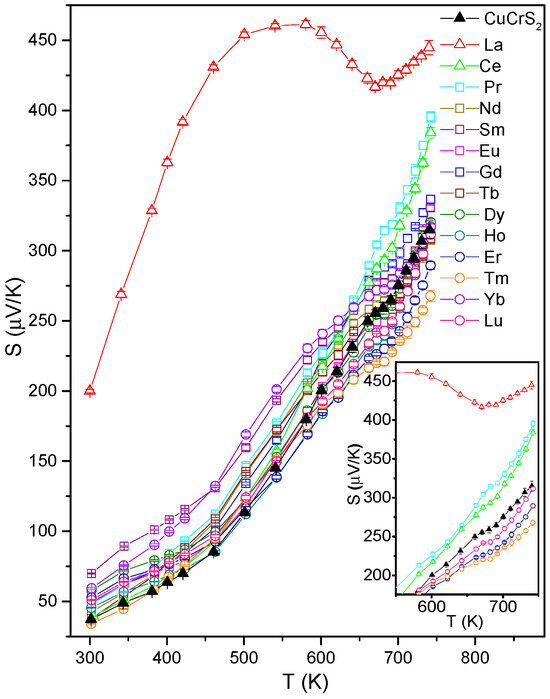 The Seebeck coefficient temperature dependencies S(T) for the initial CuCrS2-matrix and CuCr0.99Ln0.01S2 (Ln = La…Lu) compounds are plotted in Figure 1. The measured S(T) dependencies demonstrated similar behavior to those of the initial matrix. However, the dependency of the compound doped with lanthanum atoms demonstrated a different behavior (red curve in Figure 1). As can be seen in Figure 1, the measured S(T) dependencies can be divided into two regions. The first one corresponds to a temperature range of 300 to 500 K. Here, the doped compounds exhibited an increase in the Seebeck coefficient value compared with the initial matrix, except for the samples doped with Tm and Ce. At the second temperature range (T > 500 K), the compounds doped with La, Ce, Pr, Gd, and Tb demonstrated further increases in the Seebeck coefficient. In contrast, the cationic substitution with other lanthanide atoms caused Seebeck coefficient suppression. At a temperature region of 650–700 K, an inflection feature was observed. As was previously reported, this could be due to the order-to-disorder (ODT) phase transition that occurs in CuCrS2-based compounds [10,11,12]. Note that for the initial CuCrS2-matrix, the ODT is accompanied by a significant reconstruction of the electronic structure, leading to the vanishing of the band gap [12]. The inflection feature can be primarily observed for CuCr0.99La0.01S2. For clarity, Figure 1 plots the enlarged region of the S(T) within a temperature range ~100 K below and ~50 K above the ODT at ~690 K.