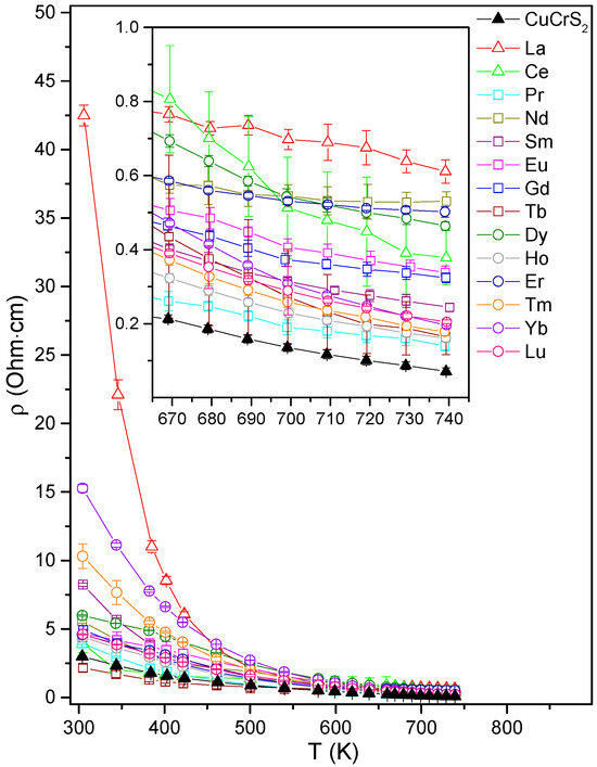 The temperature dependencies of the electrical resistivity (ρ) for CuCr0.99Ln0.01S2 exhibited typical behavior for these semiconductor compounds (Figure 2). The electrical resistivity gradually decreases with temperature. The doped samples, except those with Tb, demonstrate an increase in ρ compared with the initial matrix at 300 K. However, in the high-temperature region, the lower electrical resistivity value corresponds to CuCrS2. In the case of CuCr0.99Ln0.01S2, the lowest value can be observed for CuCr0.99Pr0.01S2, while the largest one can be observed for CuCr0.99La0.01S2.