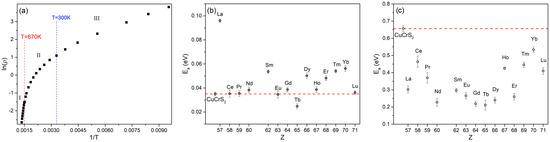 The representation of ln(ρ) in the inverse temperature scale (1/T) can be used to estimate the activation energy value (Ea). An example of inverse temperature dependence for the initial CuCrS2-matrix is plotted in Figure 3a. The observed dependence can be divided into several parts, revealing two linear regions. The first one can be attributed to the high-temperature region (T > 670 K), while the second one can be attributed to the lower-temperature region (T < 300 K). The third region between 300 to 670 K exhibited non-linear behavior related to the influence of the ionic conductivity of the CuCrS2-matrix. The calculated values of Ea, as a function of the lanthanide atomic number, are plotted in Figure 3b,c. At temperatures below 300 K, the largest value of Ea corresponds to the La-doped sample, which exhibited the largest values of S (Figure 3b). This could be attributed to the increase in the band gap discussed above. An increase in Ea was also observed in the Sm-, Dy-, Er-, Tm, and Yb-doped samples. The values of Ea for the samples doped with Ce, Pr, Nd, Eu, and Lu are comparable to those of the initial matrix. The observed decrease in Ea for the Tb-doped sample could be attributed to the localization of the Tb4f-states in the energy region between the Fermi level and the conduction band bottom. The linear behavior of ln(ρ) at the high-temperature range (T > 670 K) is related to a change in the electrical conductivity mechanism of CuCrS2, for instance, the transition from the p-type conductivity to mixed electronic–ionic conductivity in CuCrS2-based compounds at temperatures above 670 K [9,13,14]. The calculated Ea values at T > 670 K are plotted in Figure 3c. Note that the obtained values are one order of magnitude greater compared with those at T < 300 K. The cationic substitution led to a decrease in activation energy compared with the initial matrix. The Ea values tend to decrease up to Tb and then increase. This could be due to an increase in sample defectiveness caused by the difference between the ionic radii of Cr and the substituted ion, as was reported for CuCr1−xVxS2 [9,13,14].
