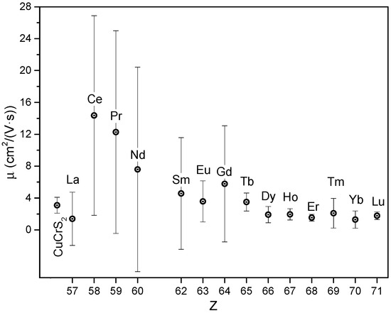 The calculated Hall mobility (µ), as a function of the lanthanide atomic number (Z), is plotted in Figure 4. It was previously shown that the lanthanide atom type affects the charge carrier concentration value. The electronic structure reconfiguration and the redistribution of the partial density of states (pDOS), both in the conduction and in the valence band during the cationic substitution, result in variation in the charge carrier concentration of CuCr0.99Ln0.01S2. The cationic substitution leads to the emergence of the additional f-states of lanthanide atoms in the Fermi-level region. For instance, the charge carrier concentration value for CuCr0.99Ln0.01S2 doped with lanthanides from La to Gd is decreased compared with the initial CuCrS2-matix [35,39]. Cationic substitution with Tb, Dy, Ho, Er, and Lu demonstrates values comparable to those of the initial CuCrS2-matrix. Thus, one can conclude that the carrier concentration in CuCr0.99Ln0.01S2 is proportional to the lanthanide atomic number. The Hall mobility value, µ, of the initial CuCrS2-matrix was 3 cm2/(V·s). The obtained value was lower compared with ~10 cm2/(V·s), which was reported for the crystal flake of CuCrS2 [30]. This could be attributed to the differences in the real spatial structure of the ceramic and crystal flake samples. For instance, the additional scattering of charge carriers at grain boundaries can significantly affect the overall charge carrier mobility. Note that the high confidence intervals for both measured values of the Hall voltage and electrical resistivity resulted in the low accuracy of the final carrier mobility value for the doped samples from La to Gd. However, the tendency of µ to decrease towards the end of the lanthanide series can be observed. This could be attributed to an increase in the scattering of charge carriers by the heavier lanthanide ions. Note that the decrease in charge carrier mobility correlates with an increase in the electrical resistivity of CuCr1−xLnxS2 compounds compared with the initial CuCrS2-matrix.