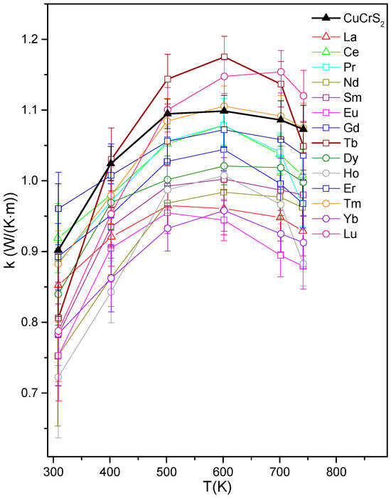 The behavior of the thermal conductivity temperature dependencies for the CuCrS2-matrix and the lanthanide-doped samples was similar (Figure 5). The obtained dependencies can be divided into two regions. The first one corresponds to an increase in thermal conductivity due to an increase in both the charge carrier concentration and the lattice thermal conductivity at 300–500 K. Note that the lattice thermal conductivity is determined by the heat capacity, phonon phase velocity, and phonon mean free path length [42,43]. The heat capacity of CuCr0.99Ln0.01S2 increases as a function of temperature, reaching a maximum of the ODT temperature region [12,41]. The thermal conductivity at the higher temperature range can be attributed to a heat capacity decrease or an increase in the phonon scattering induced by the mobile copper cations (the PGEC concept). The thermal conductivity value of ~1 W/(m·K) measured for the initial CuCrS2-matrix correlated well with the data reported previously [30,31,44,45]. The cationic substitution led to a decrease in the thermal conductivity of CuCr0.99Ln0.01S2 compared with the initial matrix, except for the samples doped with Tb and Lu. This could be attributed to the greater atomic mass of lanthanides compared with chromium, which promotes an increase in phonon scattering. The observed increase in the Tb- and Lu-doped samples could be due to the increased sample’s thermal contact conductance. Note that, unfortunately, the direct separation of the total thermal conductivity for the doped CuCr0.99Ln0.01S2 compounds into electronic and lattice components according to the Wiedemann–Franz law is not possible. This is due to several reasons. Firstly, this principle is limited to degenerate semiconductors and metals. Secondly, the mixed ion–electron type of conductivity in CuCrS2-based compounds is also affected by the total thermal conductivity.
