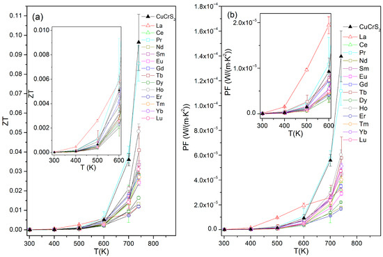The temperature dependencies of the thermoelectric figure of merit (ZT) for the doped CuCr0.99Ln0.01S2 (Ln = La…Lu) compounds and the initial CuCrS2-matrix are plotted in Figure 6a. In the room temperature region, both the initial CuCrS2-matrix and CuCr0.99Ln0.01S2 exhibited low ZT values (~10−7 ÷ 10−6) owing to the high electrical resistivity of the samples studied. As discussed above, the Seebeck coefficient of CuCr0.99Ln0.01S2 increases with temperature, while the electrical resistivity decreases, resulting in an increase in ZT. The cationic substitutions with La, Ce, Pr, Sm, and Tb allow one to increase the ZT value in a temperature range below 600 K compared with the initial matrix. The most significant enhancement of ZT was observed for the CuCr0.99La0.01S2 sample. The largest ZT value, ~0.09, was obtained for the praseodymium-doped sample and the initial CuCrS2-matrix at 740 K. Thus, La and Pr can be considered the most promising lanthanides for enhancing the thermoelectric properties of the initial CuCrS2-matrix. Another important parameter of thermoelectric materials is the power factor (PF). The initial matrix and Ln-doped samples exhibited a low PF of ~10−6 mW/(m·K2) at temperatures below 500 K. The largest PF, ~0.14 mW/(m·K2), corresponded to the initial CuCrS2-matrix at 740 K. The samples doped with La and Pr exhibited a similar trend to that observed for ZT, suggesting that they are the most promising lanthanides for enhancing the power factor (PF) of the initial CuCrS2-matrix.