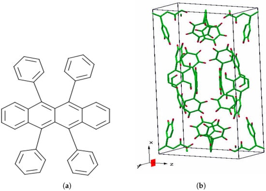 The rubrene structure is essentially a four-winged tetracene molecule [15] which belongs to the polycyclic aromatic hydrocarbon family. Organic molecular crystals are potential semiconductor materials for LEDs, solar cells, and electrical applications. Organic crystals differ from inorganic solids with covalent or ionic bondings in terms of mobility and photo-excitement due to weak intermolecular interactions [16]. Rubrene has the highest carrier mobility for holes 40 cm2/(V·s) and a high photoconductivity, which make it an exceptional OS [17]. These properties are employed in applications of rubrene in luminous and flexible devices. Rubrene crystals have closed molecular packing that is oriented in a certain direction which is known as the “b” direction; this implies that transport in a rubrene crystal is one-dimensional in nature [18]. Growing high-crystalline rubrene thin films is expensive, and this impedes its practical applications [19]. Several techniques have been developed over the years to grow rubrene thin films. Rubrene thin films can be grown in amorphous, polycrystalline, or single-crystal forms, utilizing various techniques. Some of the experimental techniques include pulsed laser evaporation of solidified solutions [20] and physical vapor transport [21].