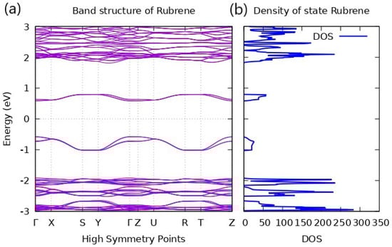 (a) Band structure of orthorhombic rubrene. (b) Density of states of orthorhombic rubrene.