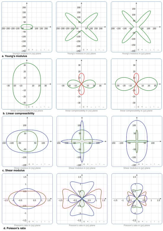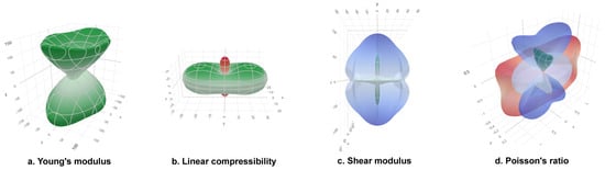 (a) Young’s modulus, (b) linear compressibility, (c) shear modulus, and (d) Poisson ratio in 3D showing its directional planes.
