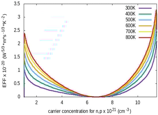 The electronic fitness function (EFF) displayed in Figure 6 shows an increase in temperature for n-p carrier concentrations, which is caused by the rising temperature and which improves its thermoelectric performance. There is a dip at carrier concentration 6.5 × 1021 for the hole concentration, and peaks are reached at 2 × 1021 and 1.1 × 1022. This work also predicts that orthorhombic rubrene has a high electronic fitness function at about 500 K. OSs like rubrene are mostly p-type semiconductors.