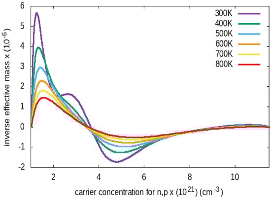 Inverse effective mass as a function of the carrier concentrations from 300 K to 800 K.