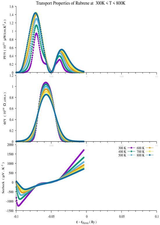 The power factor, electrical conductivity, and the Seebeck coefficient of rubrene are presented in Figure 8. This is shown with respect to temperature in the range of 300 to 800 K. Our power factor results show that the power factor increases as the temperature increases. Our results of the electrical conductivity and the Seebeck coefficient indicate that rubrene displays a promising thermoelectricity. In particular, the higher the Seebeck coefficient in any material, the better the efficiency of such material for thermoelectric properties. For rubrene, the highest and lowest values of the Seebeck coefficient are noted at room temperature, which implies that this material has a good thermoelectricity trait. The peak maximum for the p-type doping is found at 1800 μV.K−1, while the minimum at n-type doping is found at −1300 μV.K−1.