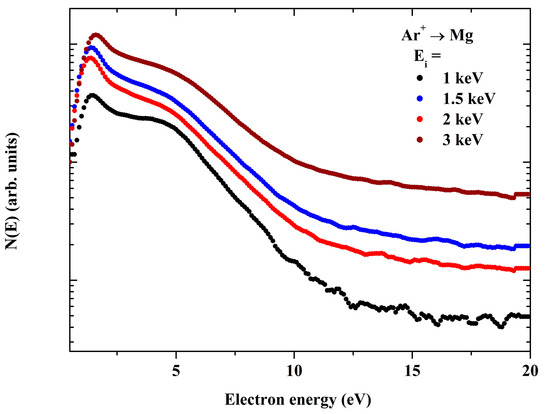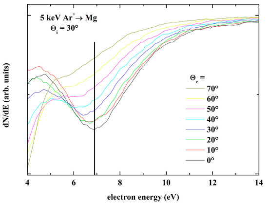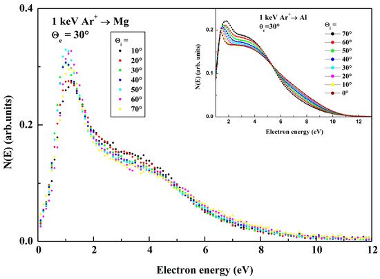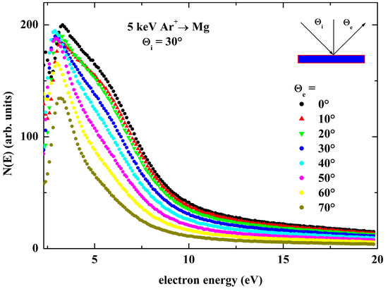 The spectra show a peak at low energy that it is assigned to emission of secondary electrons excited by the transfer of the kinetic energy of incoming ions. Superimposed to the secondary electron spectrum we observe the broad feature we want to investigate. If this broad feature superimposed to the KEE peak were due to AN, we should observe the characteristic broadening of the high-energy edge of the spectra, as the incidence direction of the ion beam approaches the surface normal, that is, as the velocity of the ion normal to the surface increases [28,50]. This broadening has been observed in the spectra excited by 1 keV Ar+ on Al surfaces [32], which are reported for comparison in the inset of Figure 3. The broadening of the electron energy distribution observed for Argon impact on Aluminum is typical of Auger neutralization. It is due to the distance dependent shift of atomic energy levels near the surface of the solids and to the non-adiabaticity of the process because of the finite ion velocity normal to the surface. A typical characteristic of this broadening is that the spectra crosses at a point, as clearly observed on Al surface [50]. Therefore, the spectra in the inset of Figure 8 show that the neutralization of incoming Argon projectiles at Al surfaces proceed via Auger neutralization. This must be evidently attributed to the fact that the energy released in the neutralization of incoming ions is not enough to excite Al plasmons. In contrast, the spectra of electrons emitted by 1 keV Ar+ on Mg do not show such a broadening. This means that the electron spectrum is not affected by the ion velocity and therefore we assign the spectral feature to a plasmon assisted neutralization. In this case, in fact, the emission of the electrons results from the decay of an elementary excitation of the solid, which is broadened only by the finite plasmon lifetime. Therefore, unlike the Auger spectra excited at Al sample shown in the inset in Figure 8, the plasmon decay feature in Figure 8 excited by Ar ions does not broaden by the finite projectile velocity [32].