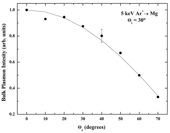 Figure 1 and Figure 2 show that the plasmon shoulder grows above the background of secondary electrons as the observation direction is moved toward the normal to the surface (as Θe decreases). The intensity of electron emission from plasmon decay can be estimated from a simple analysis of the derivatives [30,31] and are reported in Figure 3 as a function of the observation angle Θe. These intensities have been evaluated by subtracting a smooth polynomial background from the derivatives of the spectra. This subtraction results in a negative peak whose integral is proportional to the intensity of emission. We observe that the intensity of emission from decay of bulk plasmons exhibits a cosine behaviour as a function of emission angle. This behaviour is explained considering that the decay of plasmon is an isotropic source of electrons, so that electrons excited at a certain depth are more attenuated when they travel inside the solid and are emitted in directions closer to the surfaces.