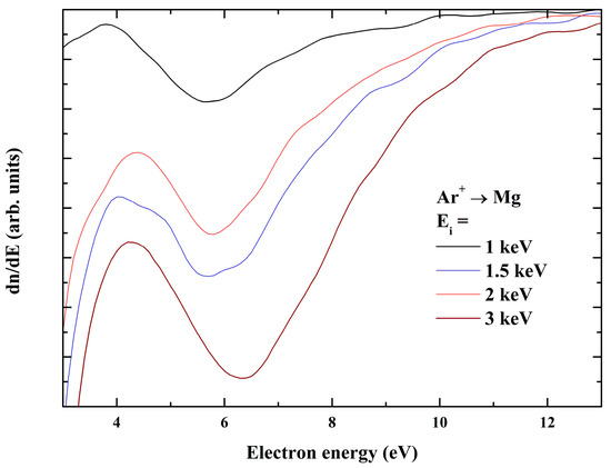 In the case of Neon, PEE produces two broad features in the spectra of emitted electrons, due respectively to the Auger Neutralization and the Plasmon assisted neutralization processes. Both these features can be identified by their characteristic high energy edge, which produces minima in the derivatives of the spectra. The potential energy transferred in the Auger Neutralization of singly charged Neon projectiles is related to the ionization potential of the incoming projectile and can be written as ΔE = I′ − ϕ, where I′ is the ionization potential of the incoming projectile, which is reduced by an energy Δ due to the image interaction with the surface, and ϕ is the metal work function. The maximum energy of emitted electrons will occur when this energy is transferred to an electron at the Fermi level of the surface. Therefore, the spectrum of electrons emitted in an Auger neutralization process have a maximum energy Eb = I’ − 2ϕ [17,19]. In the case of Neon, the ionization potential of an isolated atom is I = 21.6 eV. Given that the work function of Mg is ϕ = 3.75 eV, the emission of electrons by Auger neutralization is therefore identified in the feature revealed in the spectrum excited by 500 eV Ne+ ions in the energy range 8–14 eV, which results in the minimum in the derivative dN(E)/dE in Figure 7 at the energy Eb =12 eV, which implies a shift of the ionization potential Δ = 2 eV, consistent with earlier estimations [17]. On the other hand, the feature revealed at 4–8 eV energy in the spectrum of electrons emitted by Neon in Figure 6 and Figure 7 can be assigned to emission of electrons from the decay of plasmons [13]. The spectrum of electrons emitted by plasmon decay produces a feature with a maximum energy Em = Epl − ϕ, which corresponds to the minimum observed in the derivatives of Figure 7 at about 6 eV. This energy is about 1 eV lower than the energy expected for the bulk plasmon of Mg but matches the expectation for the excitation of a multipole surface plasmon [13,14].