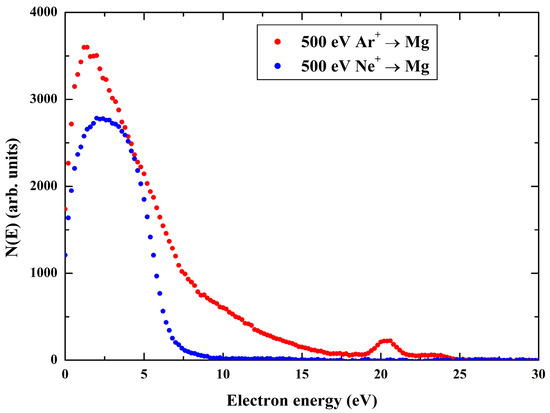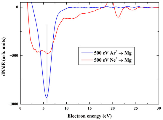 The investigation of the potential electron emission regime in the interaction of Argon ions on Mg is discussed in the following. The results for Argon will be compared with those recently obtained in the case of Neon projectiles incident on Mg [13]. Figure 6 shows the spectra acquired in the case of 500 eV Ne+ and Ar+ ion impact on Mg. At this impact energy the spectra are dominated by PEE and show its characteristic features. As above, to help in discerning spectral features superimposed to the background of secondary electrons, Figure 7 shows the numerical derivatives of the spectra in Figure 6. In this case, a slight smoothing has been applied to the derivatives, taking care that this procedure did not introduce artifacts. In the case of Neon projectiles, the spectra show also features due to kinetic emission: the low energy peak due to electrons excited in the cascade of electronic collisions inside the solid, and two lines at energies around 20–25 eV due to the autoionization of Ne 2p4 3s2 excited by electron promotion in violent binary atomic collisions with surface atoms [42,43,44,45]. These last peaks have been recently investigated for the information they provide in the electronic processes that occur in ion-solid interactions [46,47,48,49] and are not correlated to plasmon excitation [32].