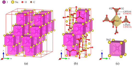 First-principles calculations were performed using the framework of density functional theory (DFT), as implemented in the Vienna Ab initio Simulation Package (VASP.5.4.4) [17]. The Projector-Augmented-Wave (PAW) method [18,19] was used to expand the electronic wave functions in a plane wave basis. The Generalized Gradient Approximation (GGA) functional was used for calculating the exchange-correlation energies, as proposed by Perdew–Burke–Ernzerhof (PBE) [20]. The PAW potentials adapted from the VASP library with the following valence configurations of 3s for Na, 5s5p for I, 2s2p for C, and 2s2p for O were used with the Na, I, C, and O POTCARs. The plane-wave kinetic energy cutoff was set to 800 eV. We performed variable cell relaxations including lattice parameters and atomic positions on the synthesized experimental structure to optimize the atomic coordinates and the cell vectors until the total forces were smaller than 10−3 eV Å−1 per atom using the conjugate-gradient (CG) algorithm. In geometry optimization, we used a Gamma-centered k-mesh of 7x7x3. To increase the accuracy of ground-state electron density and density of states (eDOS), a denser Gamma-centered k-mesh of 11x11x11 and the tetrahedron smearing method with Blöchl corrections (ISMEAR = −5) were used. The crystal structure and the ELF visualization were made with VESTA software (version 3.5.7) [21]. The finite displacement method, as implemented in PHONOPY [22], was used to calculate harmonic phonon frequencies and phonon band structures. A supercell size of 2 × 2 × 2 was used with a k-mesh size of 2 × 2 × 2 for the harmonic phonon calculations at 0 K.