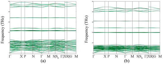 The DFT calculations reproduced the crystal structure of the Na5(CO3)2I compound in good agreement with the experiment (Table 1). The formation enthalpy (∆H) was calculated via the synthesis route of NaI + 2Na2CO3 → Na5(CO3)2I. The values of ∆H are equal to −0.217 eV/f.u. at 20 GPa (B1-type NaI [23] and the theoretically predicted P63/mcm-Na2CO3 [25] were adopted) and 0.130 eV/f.u. at 1 bar (average structure of the γ-Na2CO3 [24] and B1-type NaI were adopted). The latter value corresponds to 26 meV/atom, which is well below the “standard” 70 meV/atom limit for metastability [26]. Calculated phonon modes of Na5(CO3)2I revealed that the compound is dynamically stable both at the experimental volume of ~597 Å3 (corresponding to theoretical pressure of ~21.5 GPa) (Figure 2a) and at 1 bar (Figure 2b). These results indicate that Na5(CO3)2I, though metastable at 1 bar, is expected to be quenchable to ambient conditions.