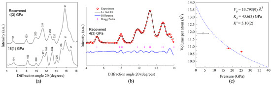 DAC #1 was fully decompressed from 18(1) GPa and opened in the glove bag in an N2 atmosphere. Then, it was closed, and the pressure after closing was 4(3) GPa. A powder XRD pattern from the recovered sample was measured in-house (see Materials and Methods). It shows that the Na5(CO3)2I was still preserved after the decompression (Figure 3a,b). The pressure dependence of the volume per atom for Na5(CO3)2I (based on the pressure–volume relations from our DFT calculations) is shown in Figure 3c along with the experimental data points. Note that the experimental data point obtained at 4(3) GPa (black circle in Figure 3c) was a result of the Le Bail fit of the powder pattern. The measured experimental volumes from SCXRD (red dots in Figure 3c) matched with the theoretical calculations, and the bulk modulus of K0 = 43.6(3) GPa (V0 = 13.793(9) Å3/atom, K’ = 5.10(2)) was determined from the third-order Birch–Murnaghan equation of state (3BM EOS).