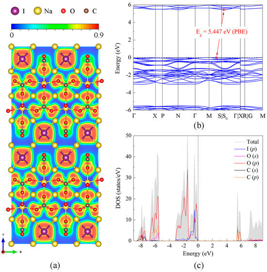 In order to analyze the electronic properties and chemical bonding of the Na5(CO3)2I compound, we performed DFT calculations of the electron localization function (ELF), band structure, and total and projected electron densities of states (TDOS and PDOS) (Figure 4).