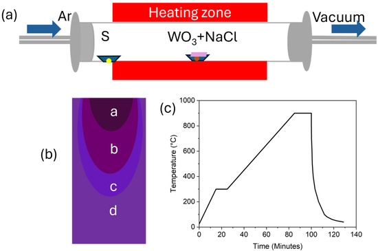 (a) Schematic of the CVD set-up and (b) a diagram depicting a typical zonal growth pattern, with different regions (a–d) corresponding to bulk, large flakes, transitioning to smaller, isolated growth, and no growth regions, respectively. (c) The temperature profile used during heating, growth, and cooling.