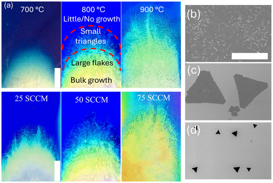 (a) Optical images showing the zonal growth pattern and relative extent of growth for (top) varying temperatures at a flow rate of 50 SCCM and (bottom) at varying flow rates at 800 °C, and representative SEM images in the region of (b) 0–1 cm, (c) 1–2 cm, and (d) 2–3 cm along the midpoint of the growth zone. The scale bar is 1 cm for (a) and 100 µm for (b–d).