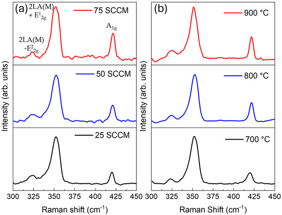 Raman spectroscopy, shown in Figure 3, confirmed that this growth corresponds to WS2. Raman measurements were taken in the central region 2 cm downstream from the leading edge of the substrate, as shown in Figure 4. Three primary peaks were observed for all samples at nominally 323, 352, and 420 cm−1, in good agreement with that of mechanically exfoliated WS2 and suggesting a lack of significant doping of halide or alkali metal atoms [26]. The peak at 352 cm−1 is a convolution of the in-plane vibrational E12g mode and a second-order mode of the longitudinal acoustic phonon 2LA(M) peak. The peak near 420 cm−1 corresponds to the out-of-plane vibrational A1g mode, while the peak around 323 cm−1 has been previously reported to result from a 2LA(M)-E22g hybrid mode [32,33]. As the peak separation between E12g and A1g increases with increasing layer number, the difference between these peaks from sample to sample may be used to identify increased growth thickness [34]. At a fixed temperature of 800 °C, the peak separation changes from 67.2 cm−1 at 25 SCCM to 68.2 cm−1 at 50 SCCM and 68.9 cm−1 at 75 SCCM, indicating that increased flow rates resulted in thicker growth at equal distances downstream, which is consistent with the greater growth observed in optical images shown in Figure 2a. Further, increasing flow rates results in an increasing A1g/E12g intensity ratio, which is also associated with increasing growth at a given downstream distance. Similarly, peak separations of 66.3, 68.3, and 69.6 cm−1 were found for growth at a constant 50 SCCM flow rate and temperatures of 700, 800, and 900 °C, respectively, consistent with expected increasing thicknesses at a fixed position for increasing temperatures. For all samples, Raman spectra indicate growths of between 1 and 4 layers [11].