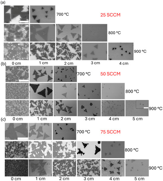 SEM images at 25 SCCM are shown in Figure 4a, with representative images taken at given substrate locations for varying flow rates to understand changes in morphology driven by flow rate and temperature. The total growth region increases as the temperature increases, with more growth downstream. At 700 °C, thin triangular crystals are observed both at the substrate leading edge and 1 cm downstream. Increasing temperatures lead to growth up to 4 cm and also drastic morphology changes, which are especially apparent at 900 °C, wherein the triangular structure becomes disordered, with similar structures referred to as dendritic, fractal, or semi-compact growth in previous works [24,25,27,35,36]. However, increasing the downstream distance decreases the overall structure size while the ordered triangular crystal structure is recovered. This recovery of triangular growth occurs at greater distances for increased temperatures or flow rates. At 50 SCCM, a similar transition is apparent, as shown in Figure 4b. However, the disordered transition occurs at the lower temperature of 800 °C, with a significantly larger disorder apparent at 900 °C and disordered growth extending further downstream. At 75 SCCM, as shown in Figure 4c, disordered growth appears even at 700 °C, and the disordered region at higher temperatures extends to even more distant regions of the substrate. It is apparent that both increased flow rate and temperature significantly enhance this transition to disordered growth. However, all structures retain a semi-compact triangular form. Even at the lowest temperatures, increasing flow rates result in disordered edges. For all samples, increasing the distance from the source results in lower density growth and the decreased size of individual elements, as expected owing to the gradient in metal precursor availability further from the substrate leading edge.