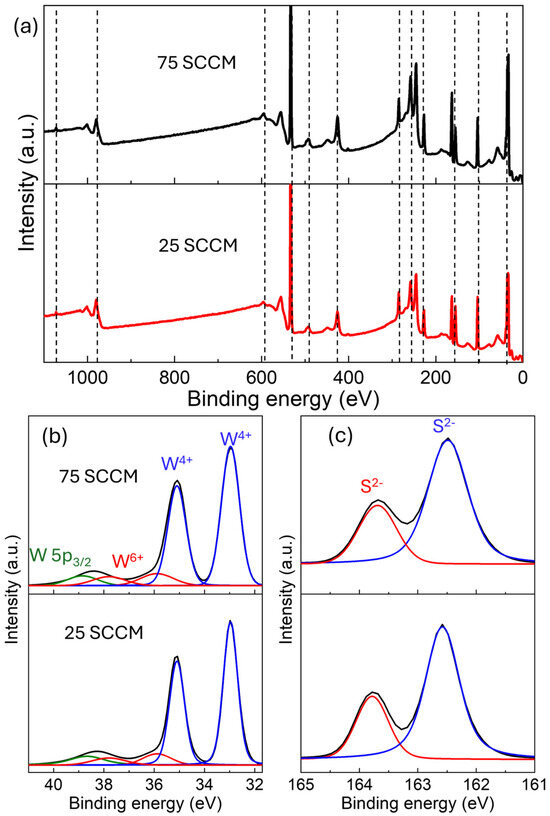 XPS spectra correspond with samples grown at 800 °C and the indicated flow rates. (a) Survey spectra showing the Na 1s, O KLL, W 4s, O 1s, W 4P1/2, W 4p3/2, C 1s, W 4d, S 2s, S 2p, Si 2p, and W 4f states in the order of decreasing binding energy. (b,c) show high-resolution scans corresponding to the W 4f and S2p states. The different rows in (b) and (c) represent flow rates indicated in (b).